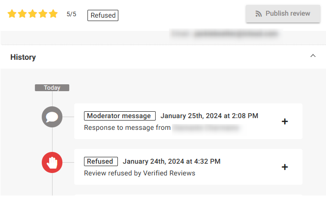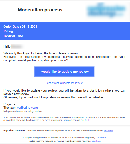 When our moderators accept the reporting of a review with this reason, the review remains published until the consumer agrees to update it.