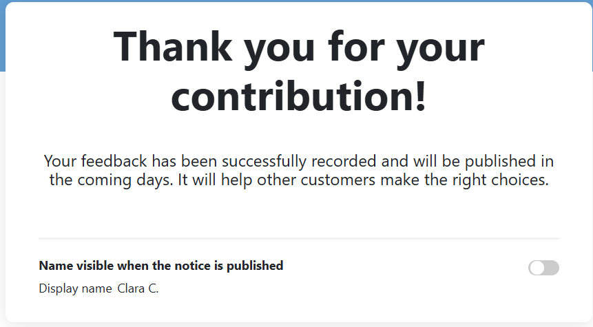 After leaving their review via the form, the consumer can choose to pseudonymize it by checking a dedicated box on the thank you page.