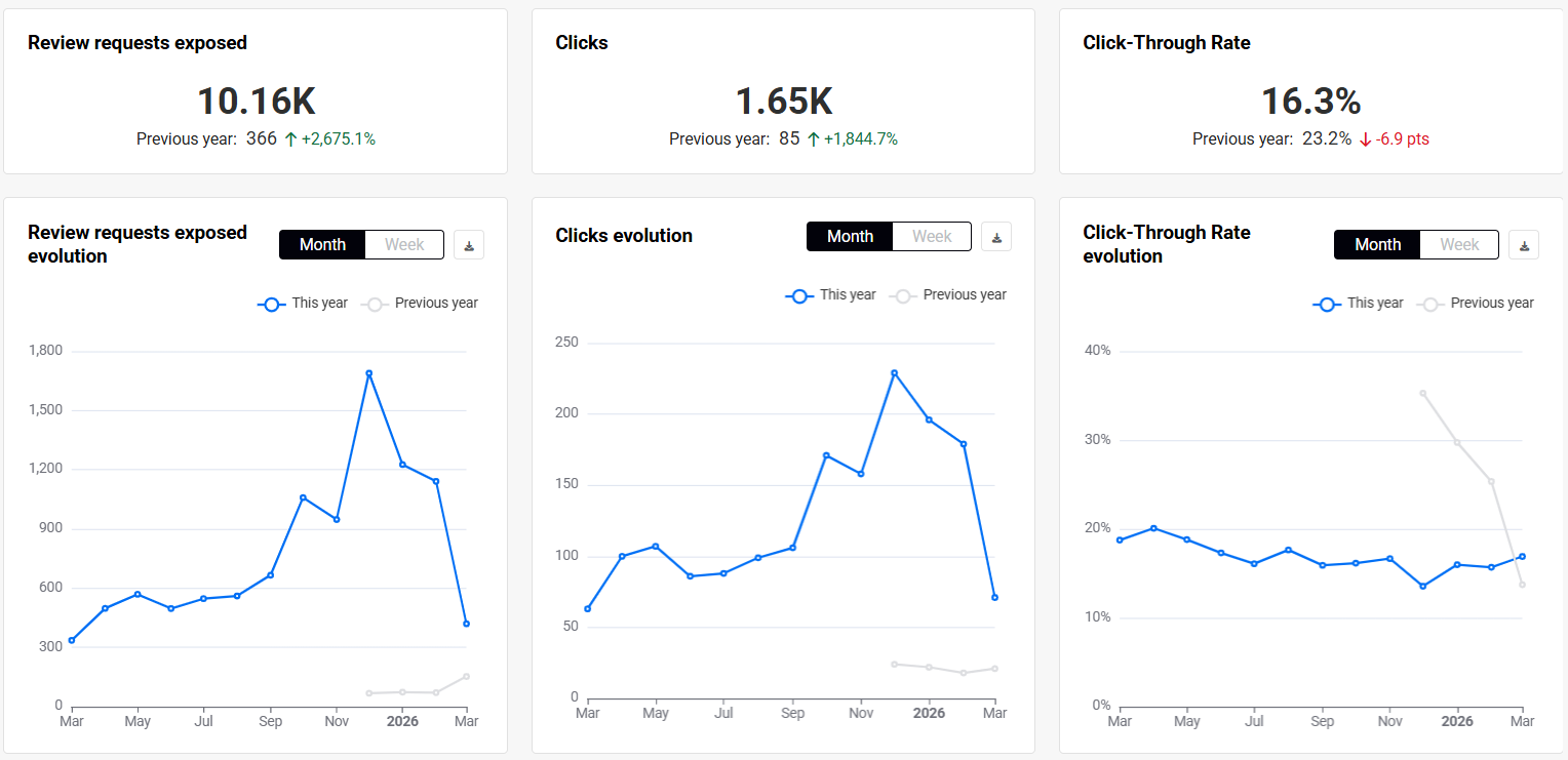 - Clicks: number of times recipients clicked on the Review Sharing banner to share their review on the third-party platform. Comparison between the current year and the previous year.