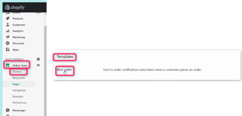 5. Next, you need to add a script to the notification email you just set up. Go to << Online store > Themes > Templates>> and click on <<New order>>