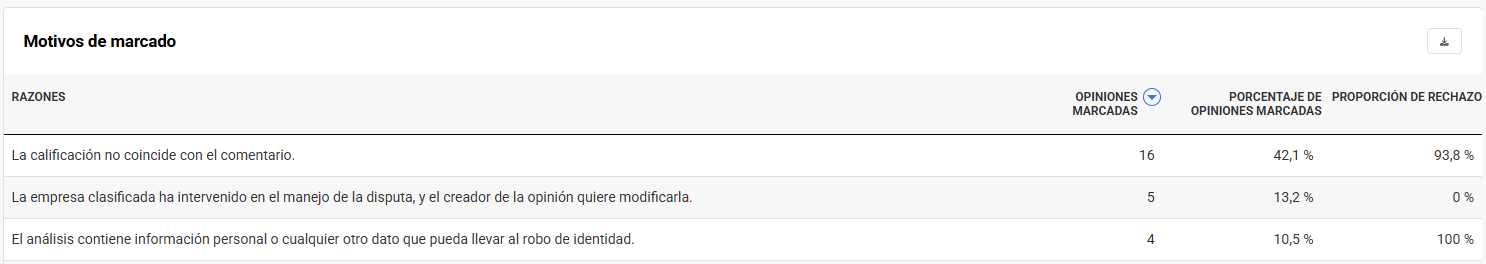 - Tratamiento de las opiniones por tu parte: total de opiniones que tú has señalado, así como el porcentaje de opiniones que has señalado (tasa de tratamiento manual).