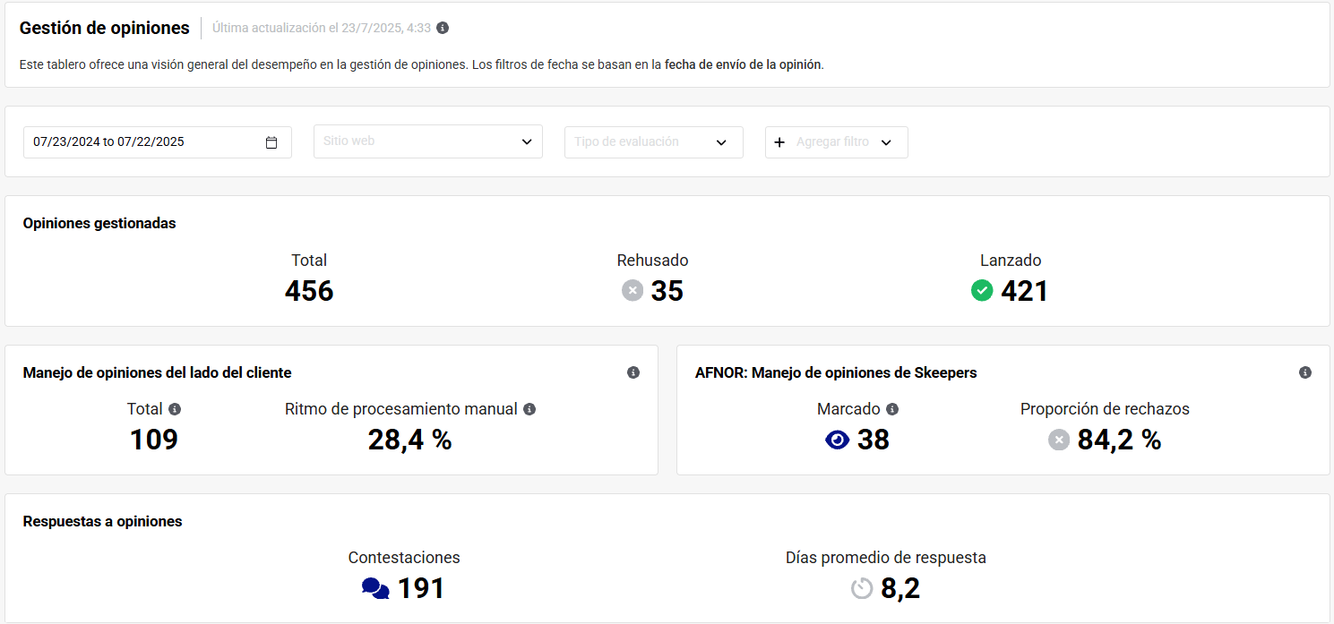 - Moderación de opiniones por Skeepers: total de opiniones señaladas por tus equipos, o señaladas automáticamente por nuestro sistema – así como su tasa de rechazo de publicación posterior.