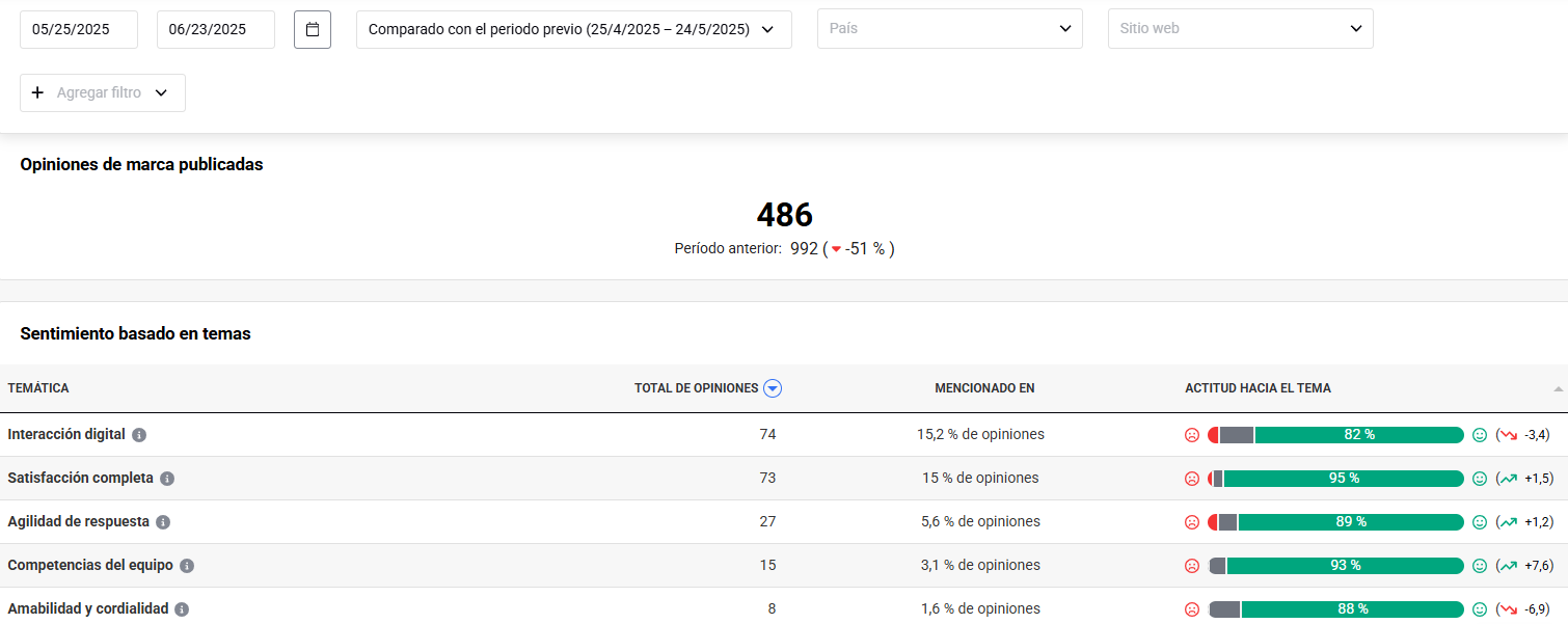 - Tasa de sentimiento positivo (%), comparado con el periodo anterior, con indicación de la tendencia (al alza o a la baja).