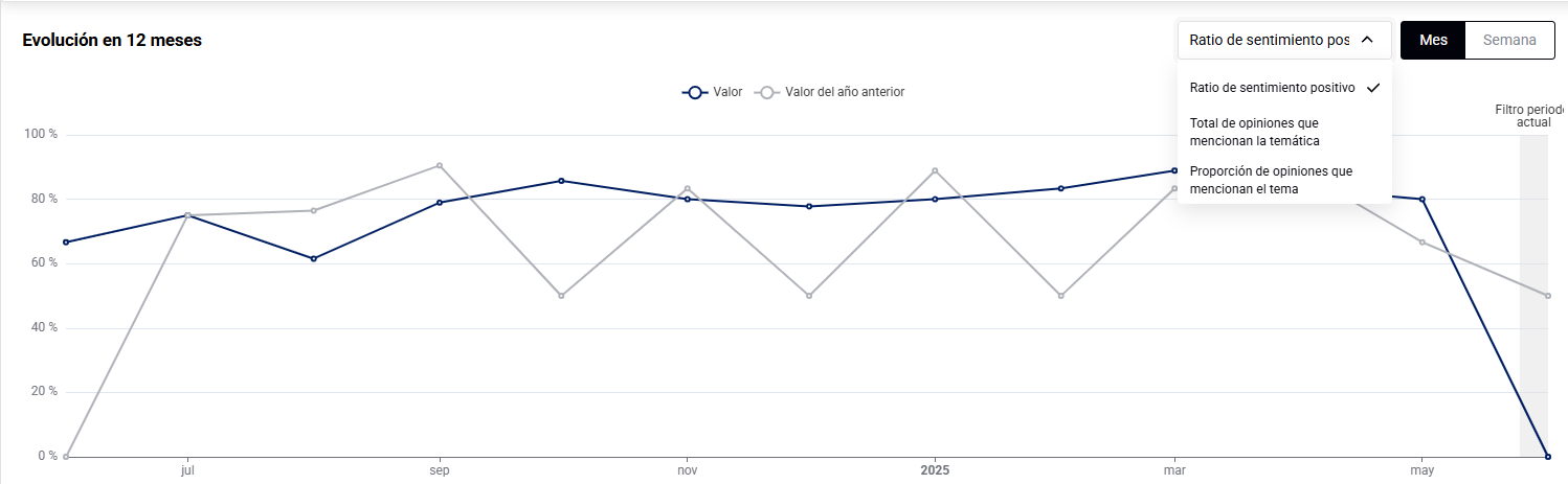 - Evolución del sentimiento positivo durante los últimos 12 meses, en vista semanal o mensual, en comparación con el año anterior.