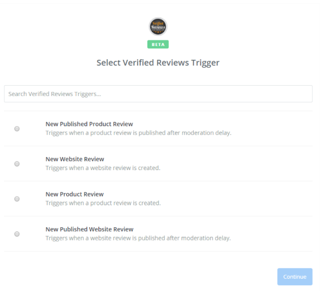 Cuatro disparadores están disponibles en la aplicación Opiniones Verificadas/Verified Reviews: