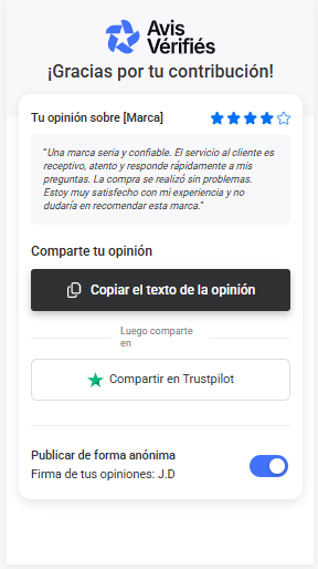 El consumidor será invitado a copiar y pegar su opinión en la plataforma que elijas: tienes una vista previa a la derecha de la página: