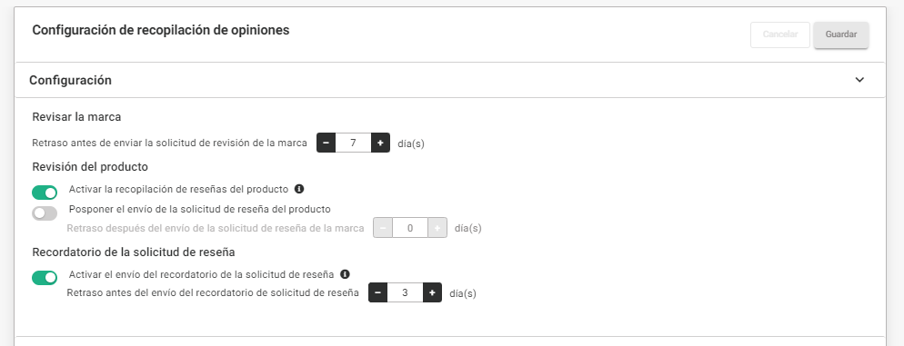 En la pestaña Recogida de opiniones - Configuración, encontrará los ajustes y parámetros que ya tenía en la versión antigua de la app. Sin embargo, tiene la posibilidad de cambiarlos si es necesario.