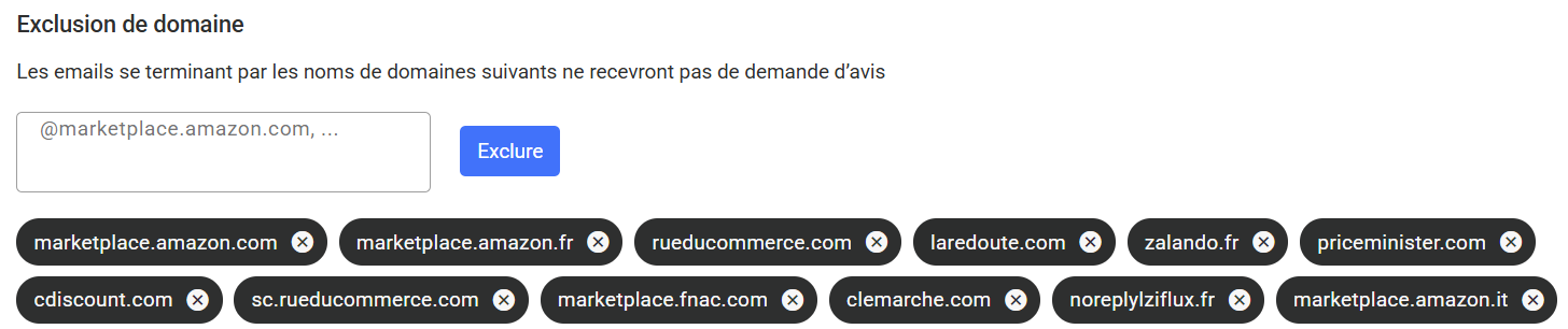 Vous pouvez renseigner dans ce champs les noms de domaines sur lesquels aucune demande d’avis ne sera envoyée. Une liste d’extensions est proposée par défaut, vous pouvez la modifier en supprimant ou ajoutant les extensions de votre choix.