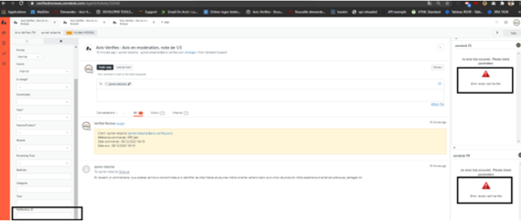 Si l'erreur qui apparait dans la partie droite de Zendesk est “Error , review can’t be found”, il est nécessaire de vérifier la configuration de Zendesk