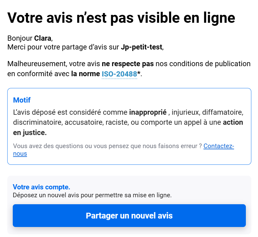 Une fois l'avis refusé par nos équipes, le consommateur recevra un email lui permettant de déposer un nouvel avis.
