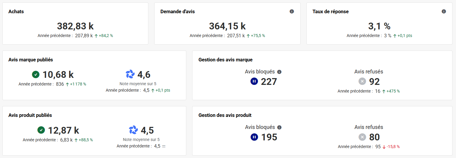 Suivre le nombre d'avis publiés, la note moyenne et les avis en attente de traitement permet d'évaluer la satisfaction client en temps réel et la réactivité dans la gestion des avis. Le suivi des avis bloqués ou refusés après signalements aide à maintenir la qualité des avis publiés et à détecter d'éventuels problèmes de modération ou de conformité.