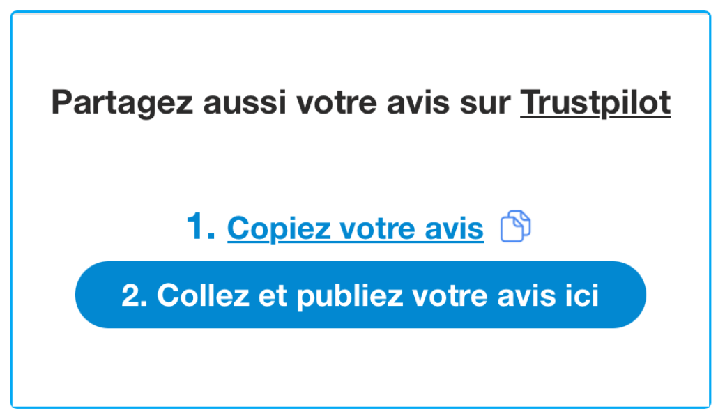- Le consommateur doit cliquer dessus pour accéder à votre page Google Business Profile ou Trustpilot, puis copier coller son avis.