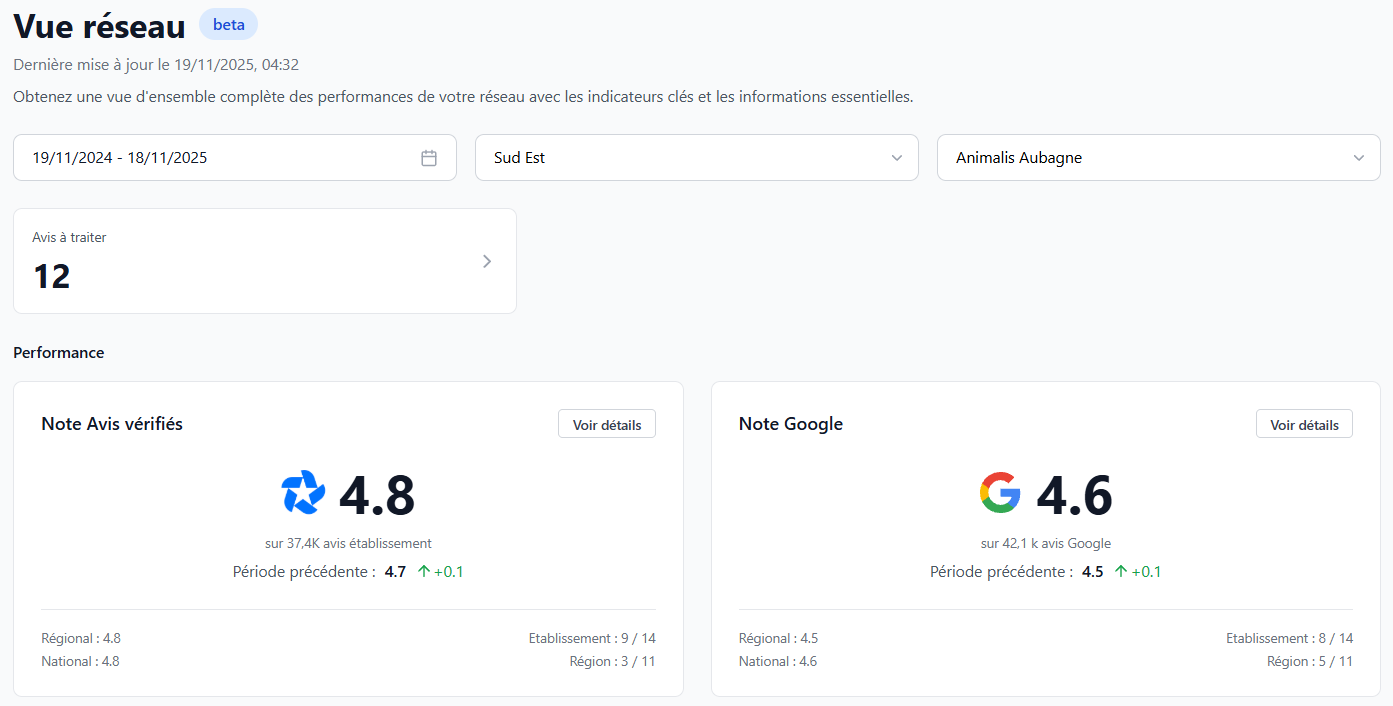 Le tableau de bord Vue réseau vous permet de piloter facilement la satisfaction client et l’e-réputation de votre établissement à partir des vos avis consommateurs.