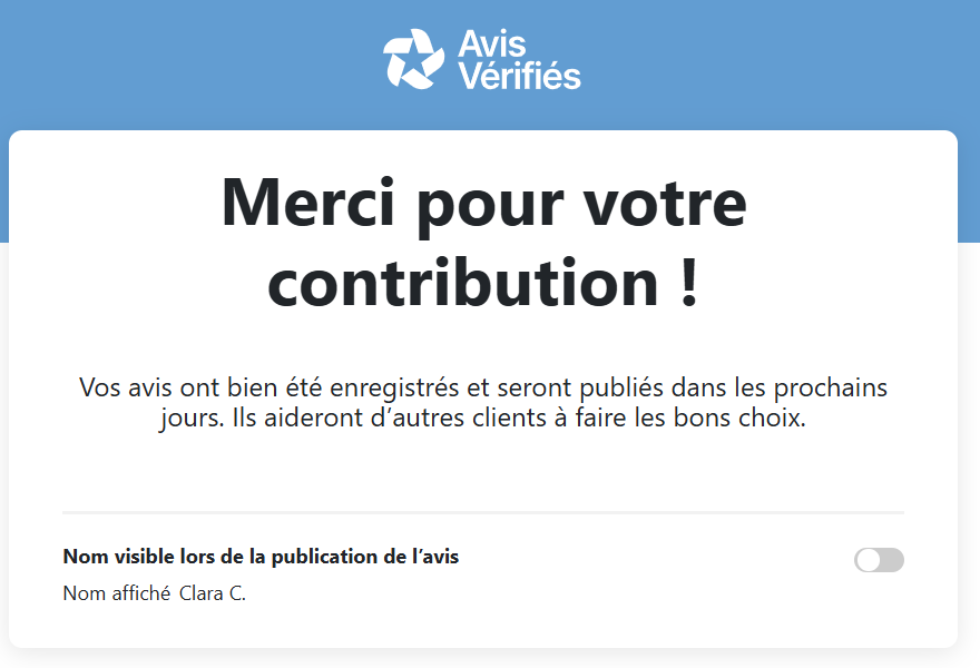 Peu importe le choix du consommateur : en aucun cas le nom de famille ne sera affiché sous les Avis Vérifiés.
