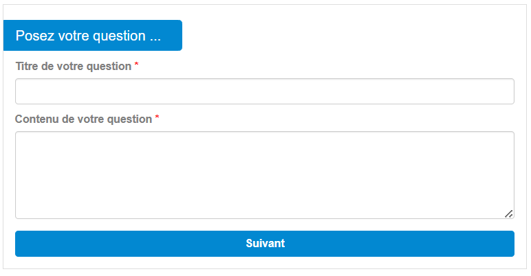 Par défaut, le bouton affiche l’étape 1/2, qui correspond aux champs à compléter relatifs au titre et au contenu de la question que l’internaute souhaite poser.
