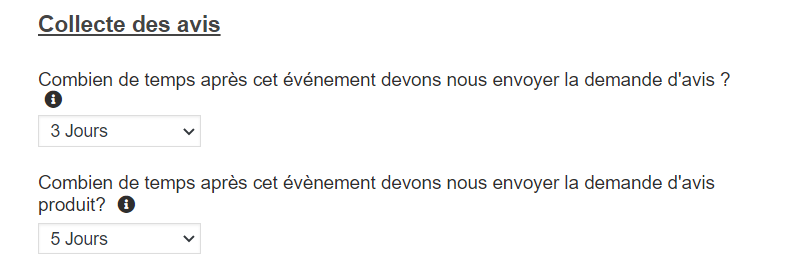 Dans l'encart "Collecte des avis", vous avez la possibilité de définir un délai pour l'envoi des demandes d'avis, qui prend effet dès que la commande est récupérée. Vous pouvez choisir un délai spécifique pour :