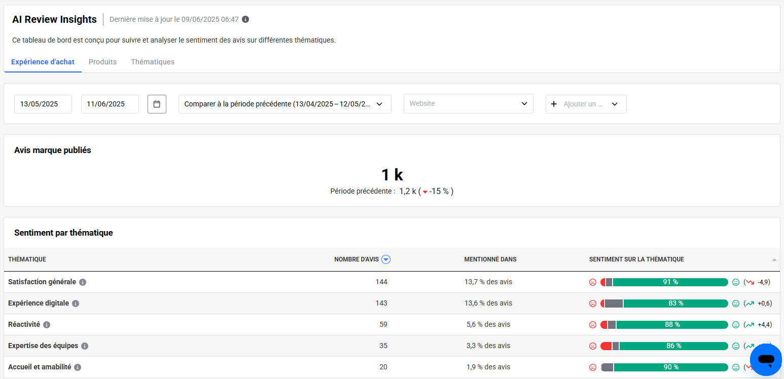 AI Review Insights automatizza l’analisi su larga scala di tutte le tue recensioni dei consumatori identificando i temi chiave discussi (accoglienza, consegna, qualità, prezzo, ecc.) e rilevando i sentimenti associati con un alto livello di accuratezza.
