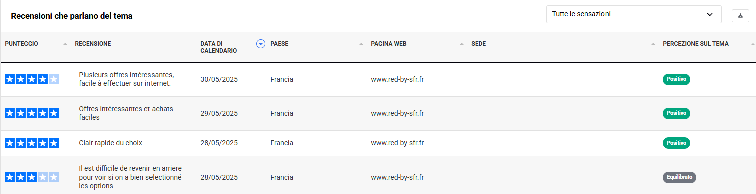 Questa sezione si basa sull’analisi delle recensioni del brand lasciate dai tuoi consumatori. Ti permette di esplorare i feedback relativi all’esperienza d’acquisto su più dimensioni.