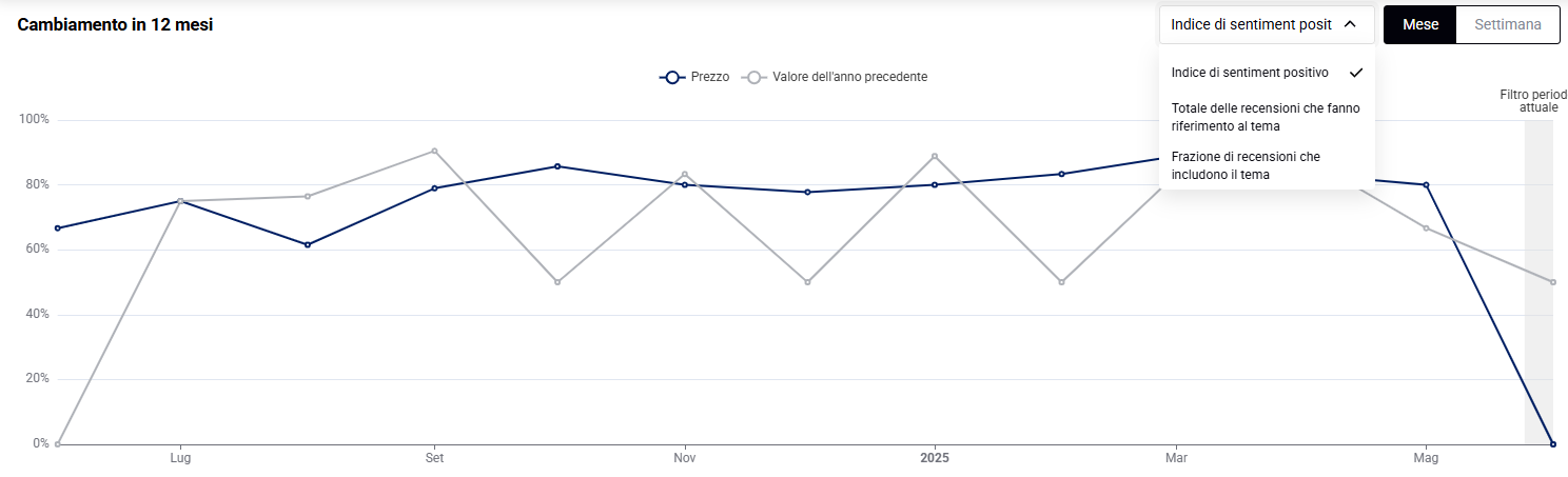 - Evoluzione del sentiment positivo negli ultimi 12 mesi, con vista settimanale o mensile, rispetto all’anno precedente.