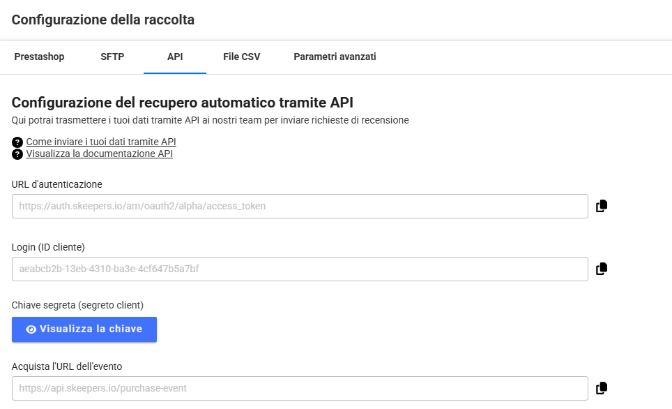 - Una volta creato l’account, potrai visualizzare i parametri della tua API: URL, client ID e client secret.