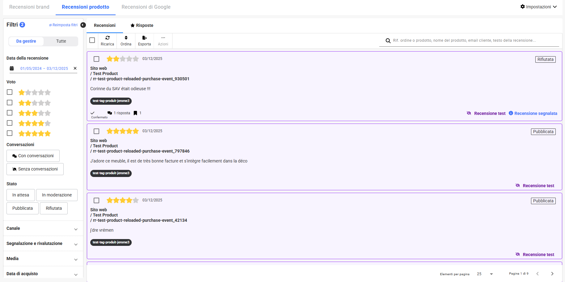 Le recensioni da gestire si trovano ora nella sezione dei filtri nella parte sinistra della pagina.