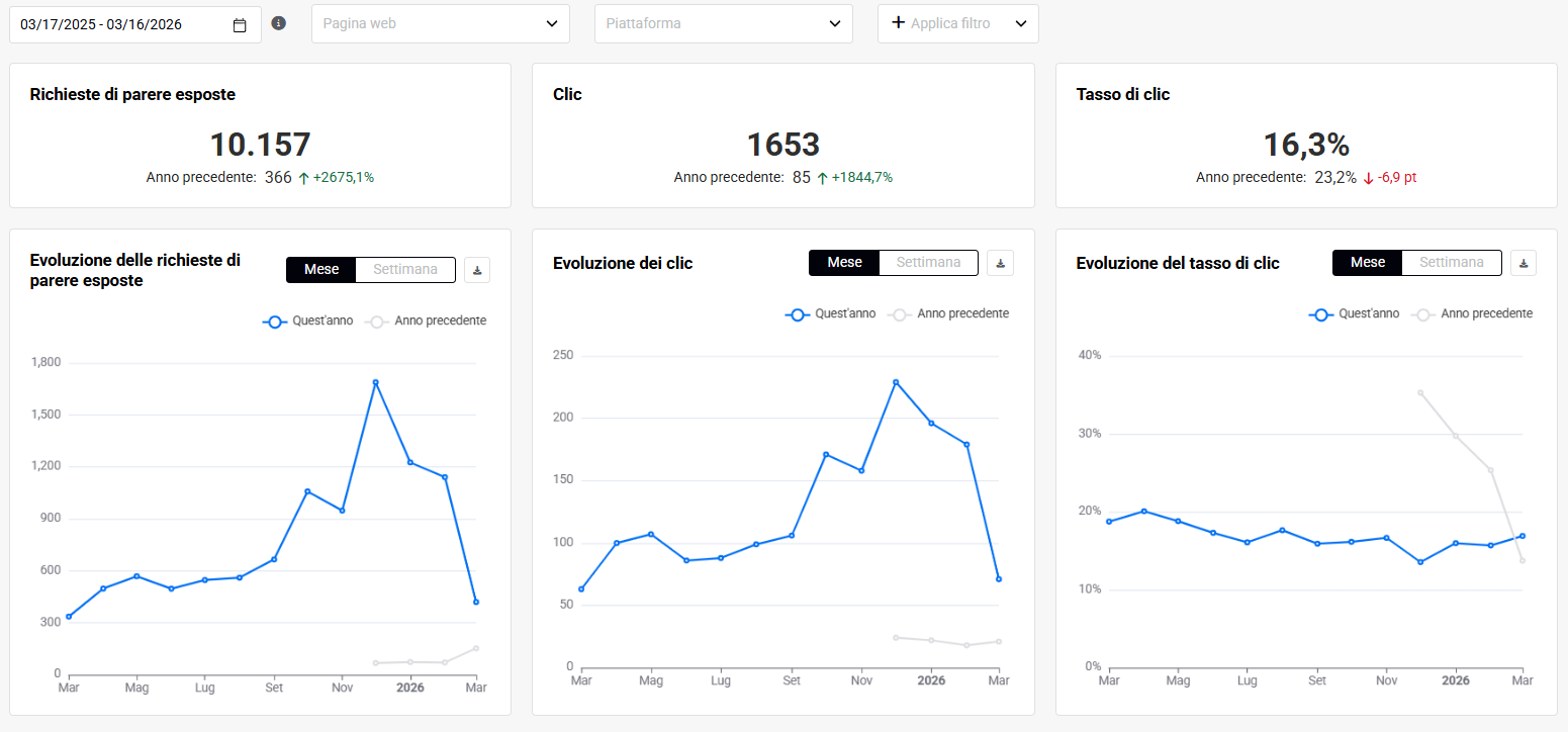 - Evoluzione del tasso di clic: percentuale di clic mensili rispetto alle richieste esposte. Confronto tra l’anno in corso e l’anno precedente.