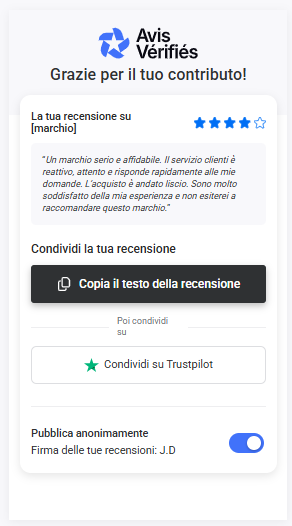 - Il consumatore deve cliccarci sopra per accedere alla tua pagina Google Business Profile o Trustpilot e quindi copiare/incollare la recensione.