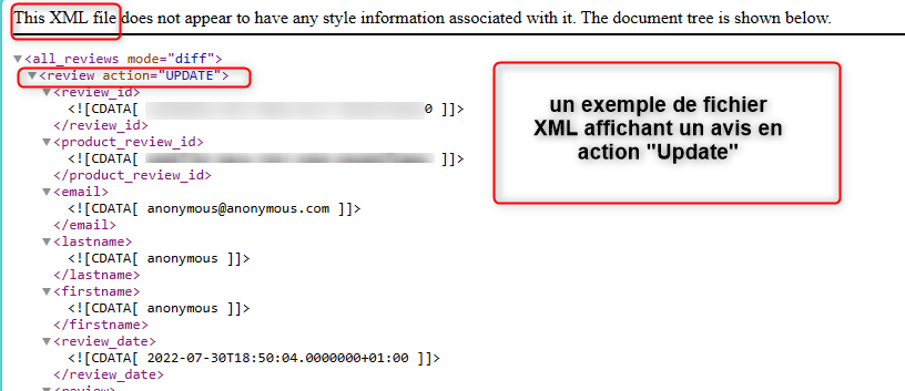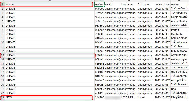 Ogni riga del file FTP/SFTP o nodo XML, dei file di recensioni recuperati, ha un tipo che indica l'azione che è stata eseguita nel database del tuo account Avis Vérifiés: