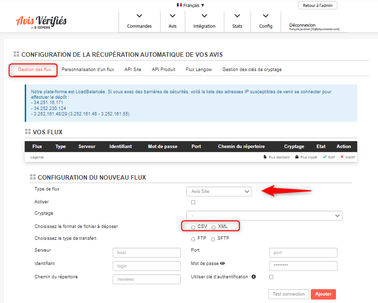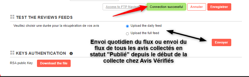 - «Testa il feed delle recensioni » : Invia immediatamente un flusso di dati al FTP/SFTP (quotidiano o completo).